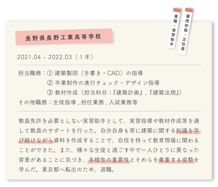 特に、CADオペレーターという職種を経験し、設計者の意図を正しく理解し迅速に図面に反映することで、生産性を高めるための情報処理力が鍛えられました。また、手戻り作業や、紛らわしい表現で誤解が生じないように正確に作図すること、図面情報を整理整頓しておくことを常に心がけて業務に取り組んでまいりました。