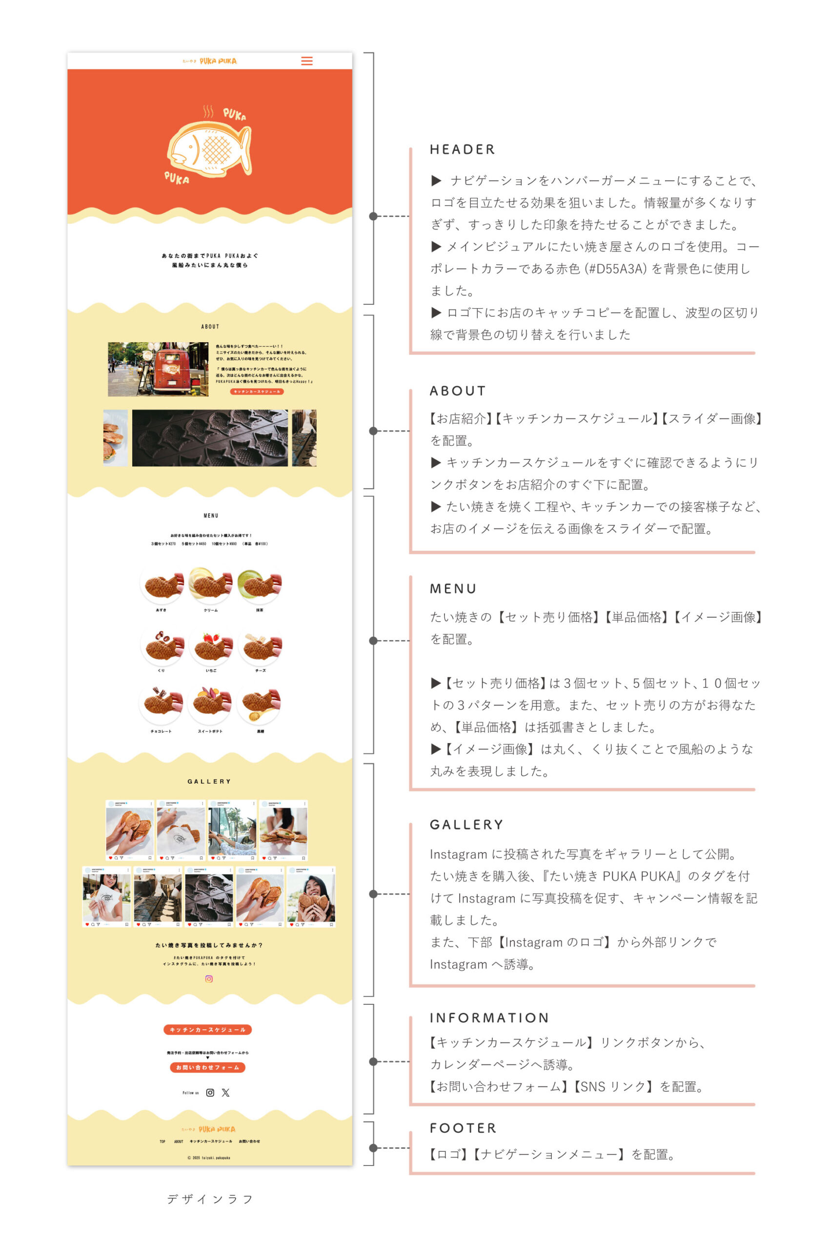 『キッチンカーで移動販売を行う、たい焼き屋さん』のLPを作成しました。『キッチンカーで様々な街を泳ぐように巡る』というコンセプトを、波型のデザインで表現しました。赤色(#D55A3A)はキッチンカーの色で、コーポレートカラーでもあります。また、たい焼きの生地や中身のクリームのイメージで、クリーム色(#F0E5AF)を多用しました。