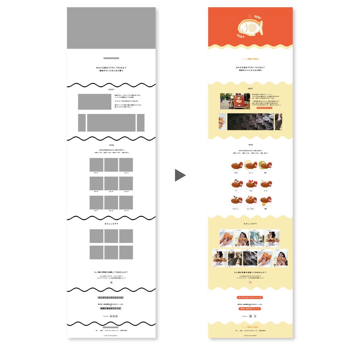Instagramに投稿された写真をギャラリーとして公開。たい焼きを購入後、『たい焼き PUKA PUKA』のタグを付けてInstagramに写真投稿を促す、キャンペーン情報を記載しました。
